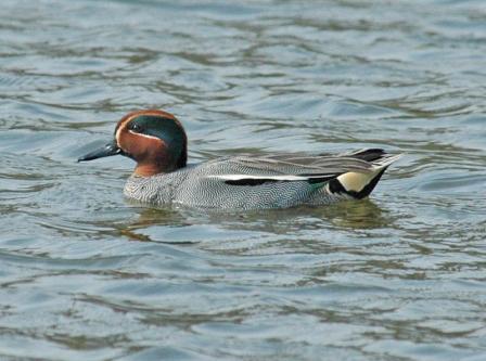 Чирок-трескунок чуть крупнее, около 500 граммов. Серое «зеркальце», белая полоска у глаз, светлое брюшко и голос «крерр-крерр» (в отличие от свиста «фрюю-фрюю» у свистунка) позволяет отличить его от меньшого братца. Выработка у бывшего кирпичного завода за Пырловкой. Уточка подплыла совсем близко, испугалась, замахала крыльями, показывая светло-дымчатое брюшко и бока, поворачивая коричневой головкой с белой полоской – как же она элегантна и красива. Трескунки предпочитают более широкие и открытые воды не только вдали от города (например, не раз видел их на озерах Глухое и Таволги), но их можно заметить и на окраине города на Верхне-Выйском пруду.